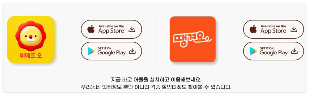 - 앱스토어에서 ‘땡겨요’ 또는 ‘위메프오’ 설치
