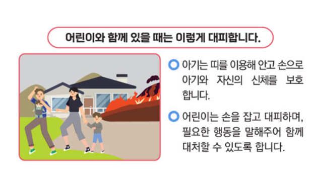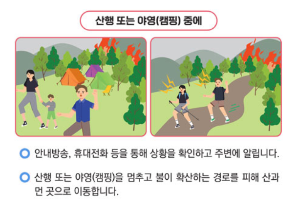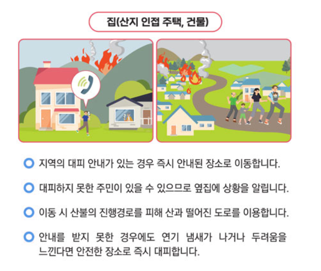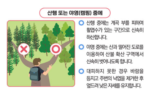 - 대피: 산불이 확산될 경우 산림에서 멀리 떨어진 논밭, 운동장 등 넓은 공터로 대피해야 합니다. 대피 시에는 이웃의 대피 여부도 함께 확인하는 것이 좋습니다.