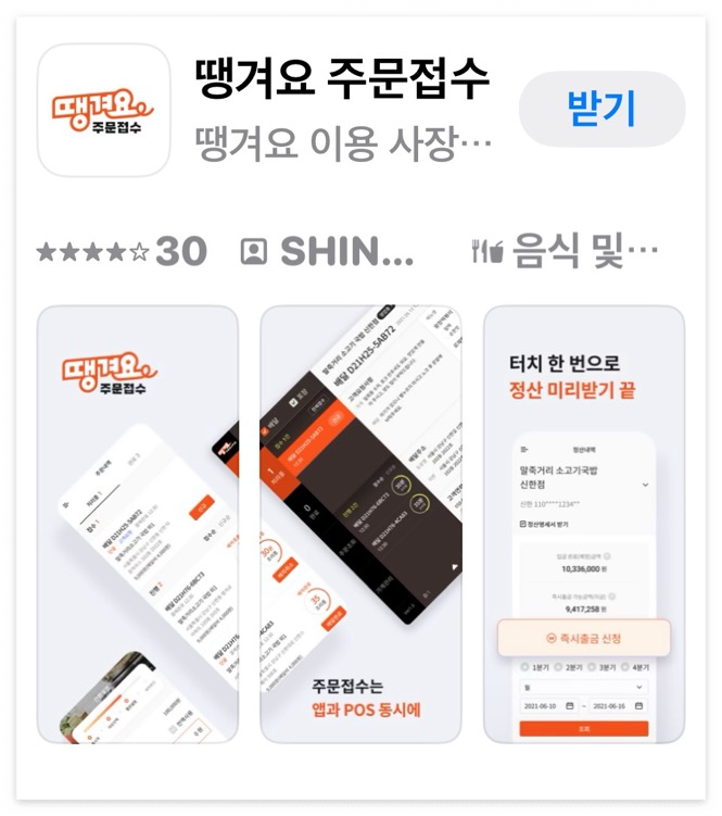 - 아이폰: 앱스토어에서 ‘땡겨요 주문접수’ 검색 후 설치
