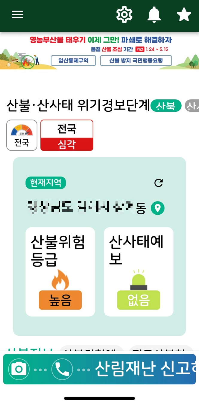 3. 그러면 우리 동네 산불등급, 발생현황이 나옵니다. 그리고 산림재난신고를 할 수 있는데, 사진을 찍을수 있고 전화를 걸 수 있습니다. 산불 이외에 산림훼손, 산사태도 있습니다. 긴급상황에 눌러서 신고를 하시면 됩니다.