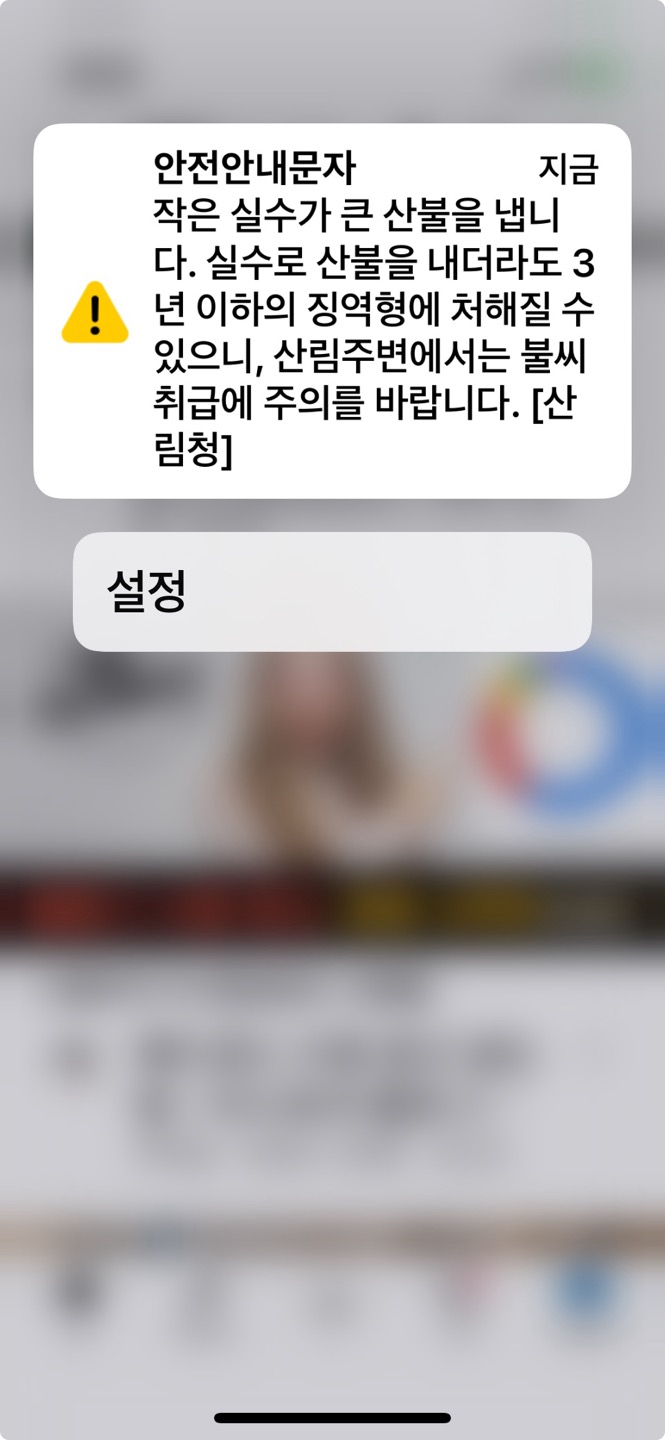최근에 산불에 관한 안내문자를 너무 많이 받고 있습니다. 받을때마다 불안하고 걱정이됩니다. 이번 산불로 난 여러 피해중에 문화재 소실도 있었는데요. 인명, 재산, 문화재까지 사라질 수 있는 큰 사고이니 어떤 방식으로든 대비하고 대비해도 부족할 것 같습니다. 만일의 경우를 대비하여 스마트산림재난 앱을 설치해두시기 바랍니다.