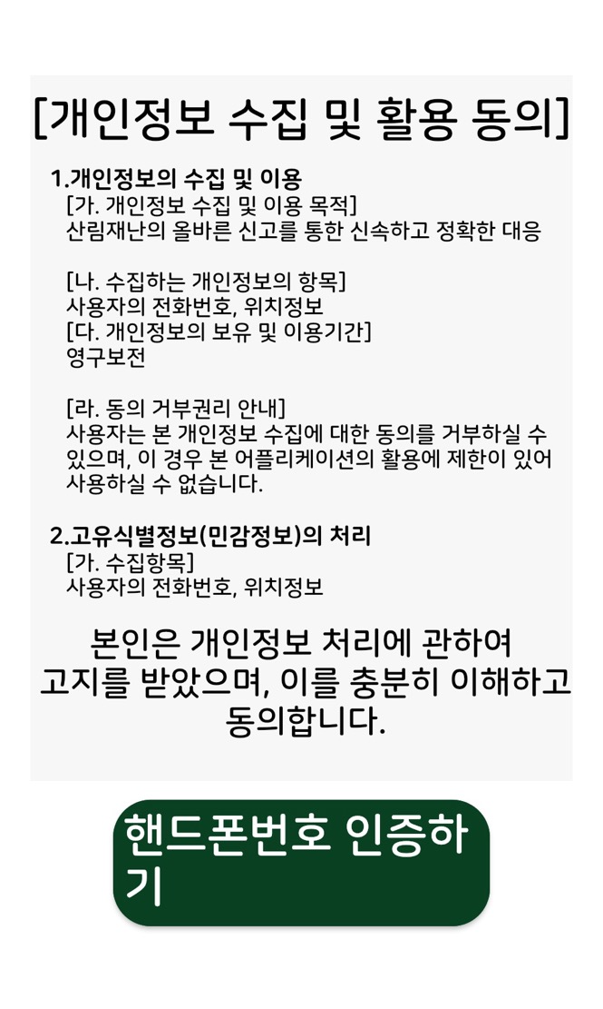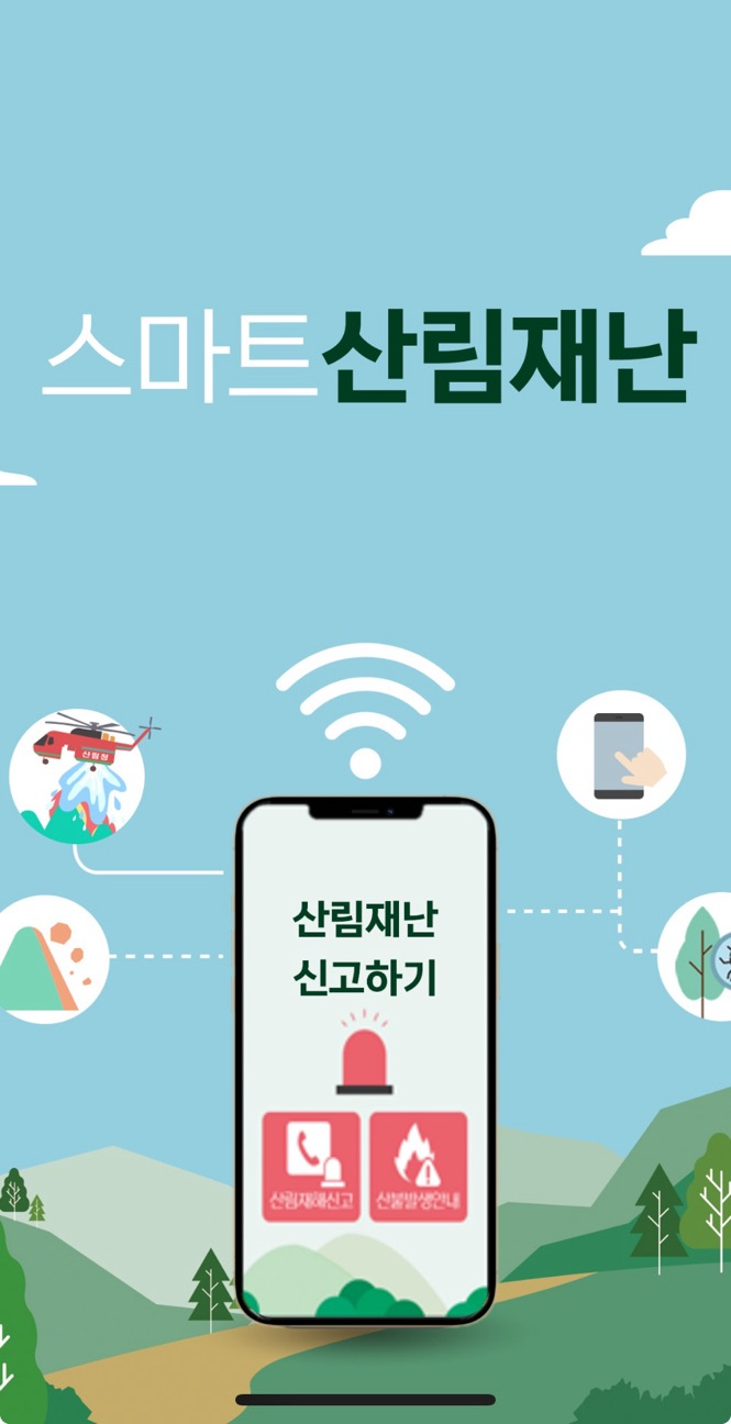 1. 앱스토어나 플레이스토어에서 '스마트산림재난' 앱을 받아 설치합니다.
