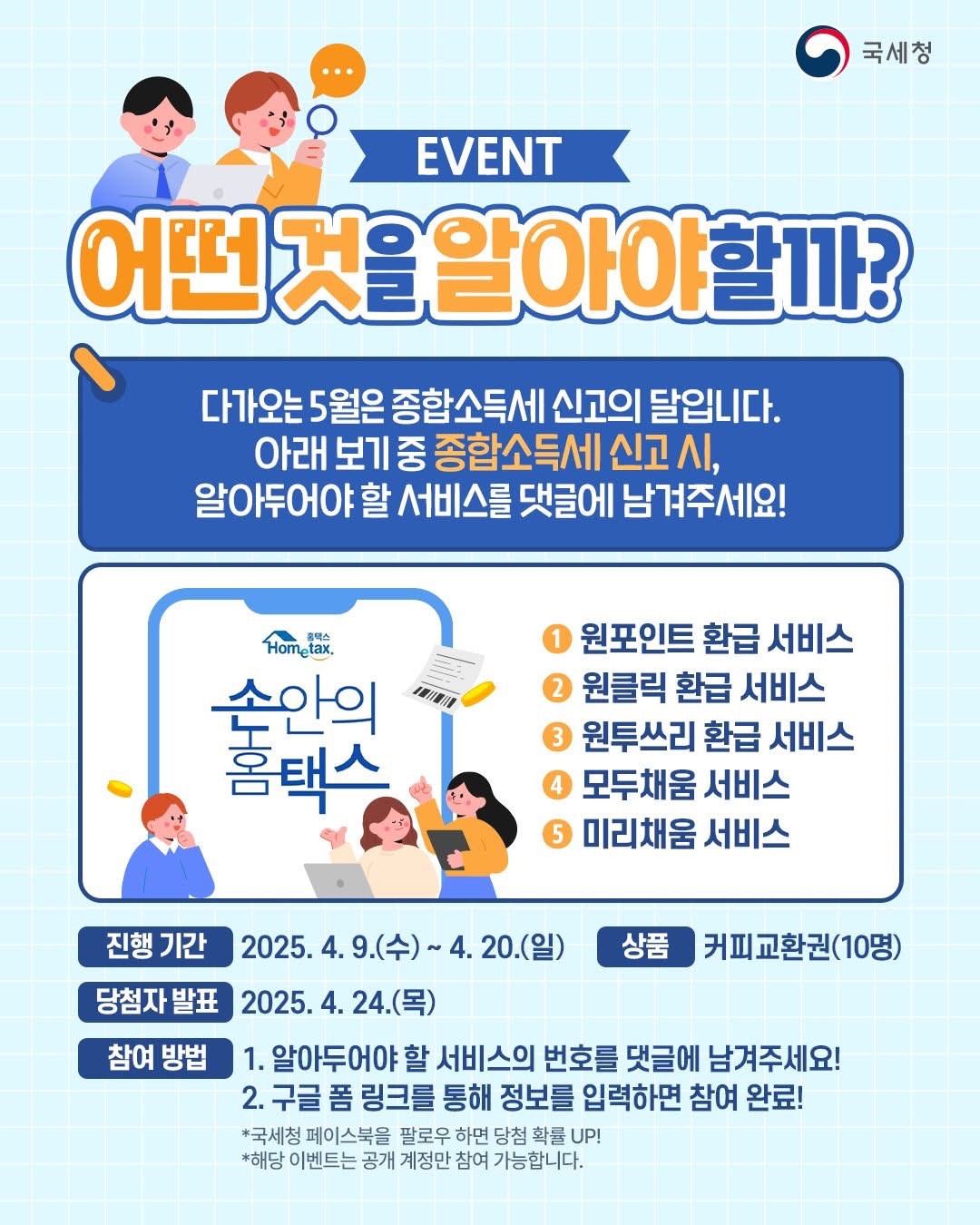 국세청에서는 5월 종합소득세의 달을 맞이하여 페이스북 이벤트를 진행합니다. 종합소득세 신고시 알아두어야 할 서비스를 묻는 내용이에요. 답은 금세 맞추실 수 있어요. 이벤트 진행내용 소개할게요.